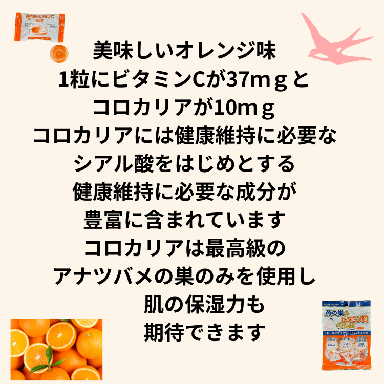 美味しいオレンジ味。1粒にビタミンCが37mgとコロカリアが10mg入っています。コロカリアには、健康維持に必要なシアル酸をはじめとする健康維持に必要な成分が豊富に含まれています。コロカリアは最高級のアナツバメの巣のみを使用し、肌の保湿力も上がります。